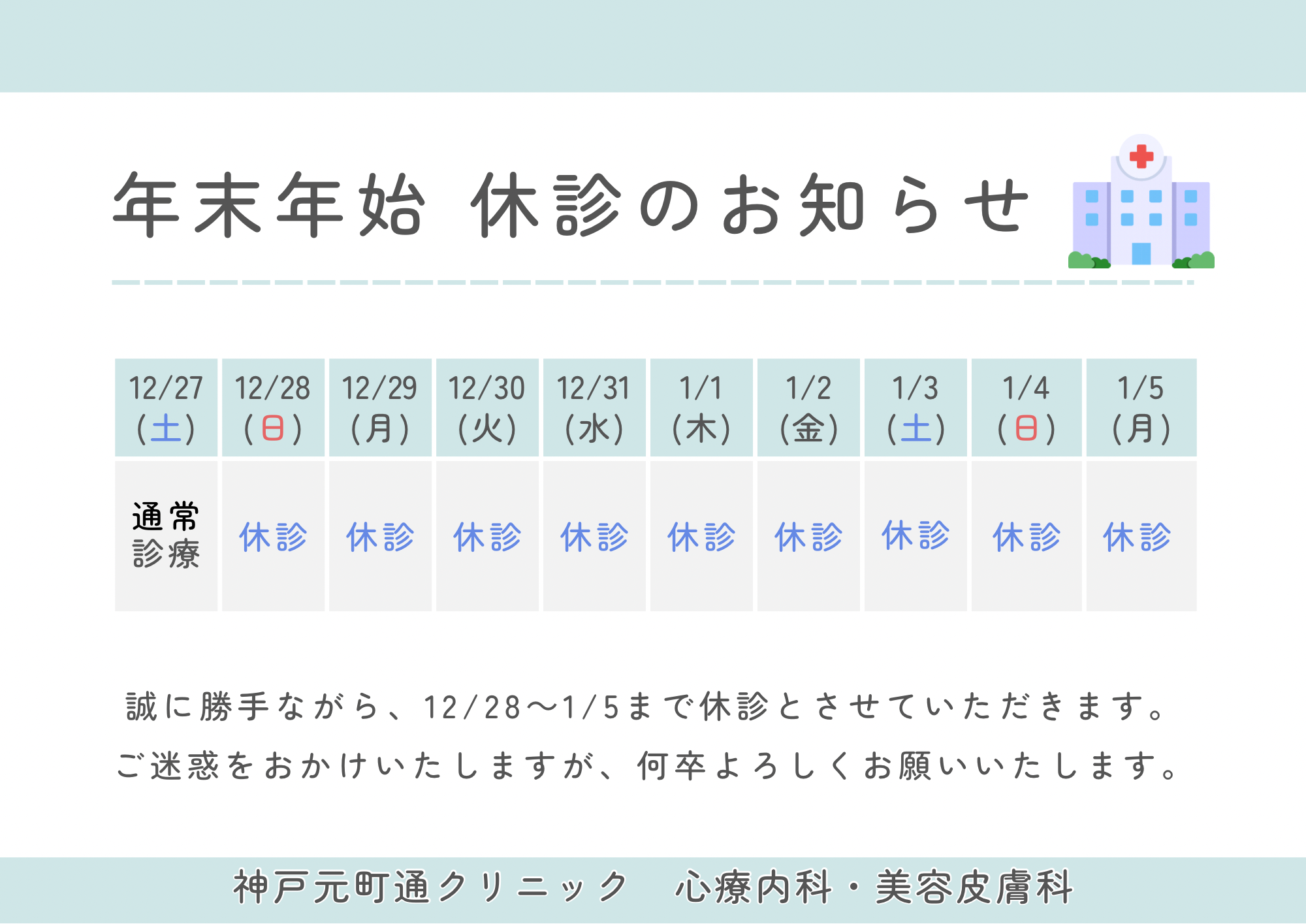 当クリニックは、年内の診療を 12月27日(土) を最終日とし、